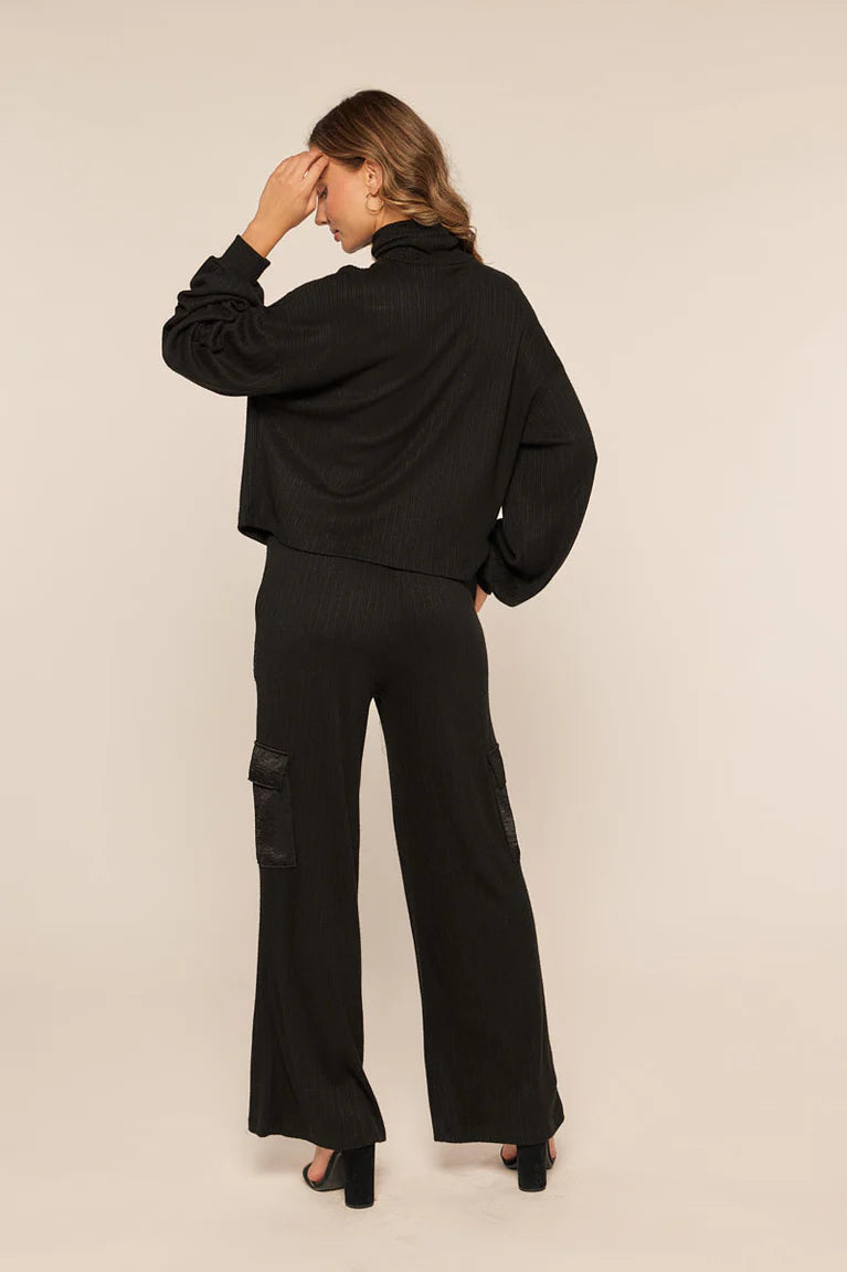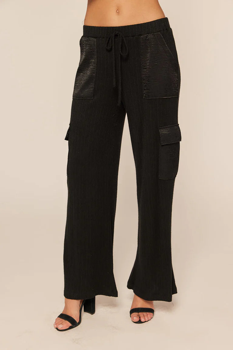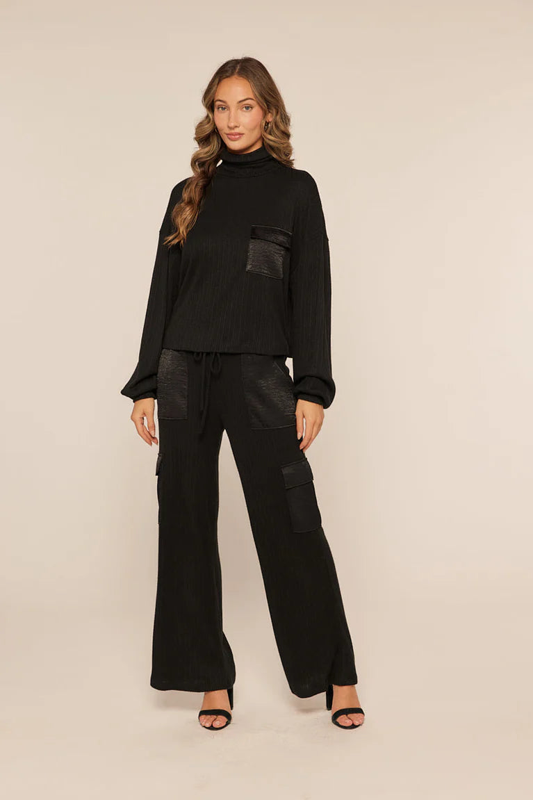 These black cargo pants blend a cozy stretch-knit rib fabric with smooth, silky pockets for a fun twist. With a drawstring waist and a relaxed wide-leg cut, they’re super comfy and effortlessly stylish. Don’t forget to team them up with the matching top for a complete look!