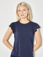 Elevate your everyday wardrobe with this fine rib ruffle tee. Crafted from soft, breathable fabric, the delicate ruffle detailing adds feminine charm and movement to a timeless silhouette. Perfect for layering or wearing solo, this versatile piece transitions seamlessly from casual days to dressed