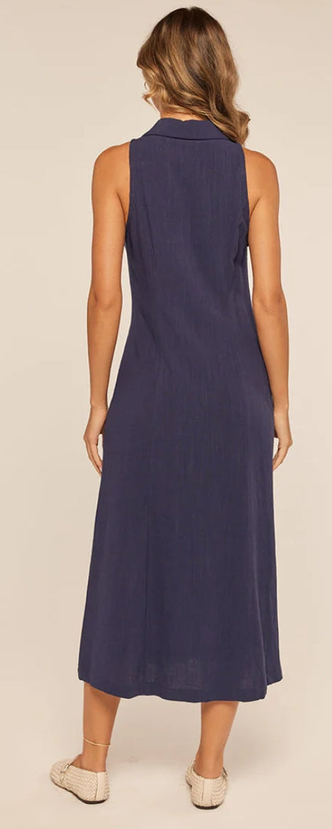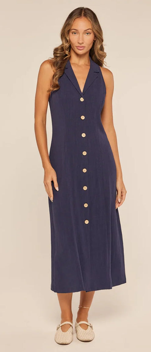 Meet your new go-to dress! This breezy linen blend midi is all about that relaxed-yet-polished vibe. With a classic collared neckline and easy front buttons, you'll be ready to take on the day in comfort and style.