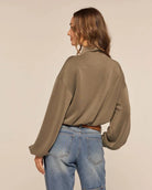 This zip-up jacket in olive features shiny silver hardware and is crafted from a comfy, stretchy fabric. It sports a mock collar, handy front flap pockets, and a snug elastic waistband for a fun, flattering fit.
