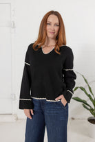This notched sweater features a beautifully embroidered back, adding a unique and stylish touch to your cozy essentials. Its comfortable fit and distinctive detail make it perfect for layering on cooler days while expressing your personal style with subtle elegance.
