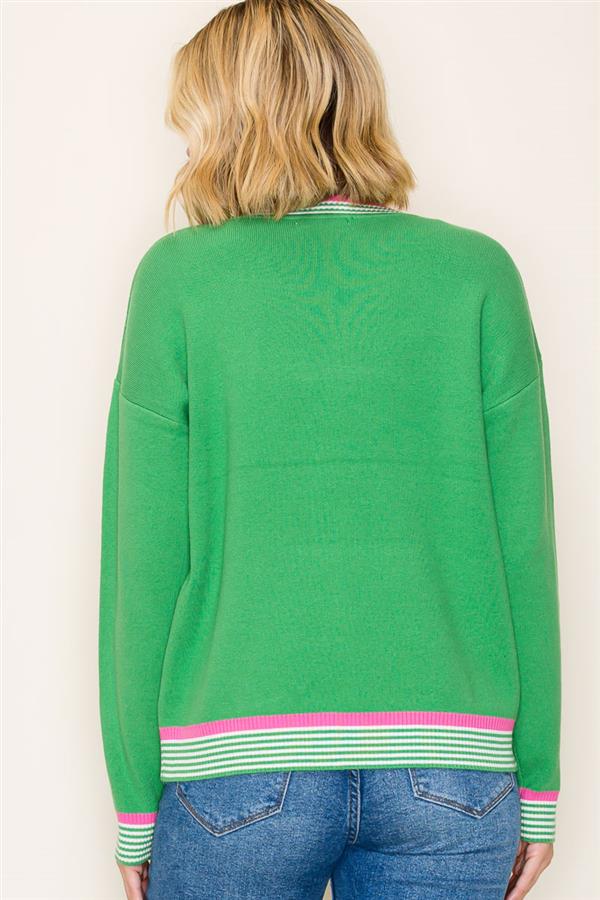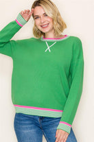 Varsity Trim Sweater Elevate your everyday style with this classic varsity trim sweater. Featuring timeless striped detailing along the sleeves and neckline, it brings a preppy, polished touch to any outfit. The soft, comfortable knit makes it perfect for layering or wearing solo during cooler months. Whether you're dressing up for a casual outing or keeping it relaxed at home, this versatile piece works seamlessly with jeans, skirts, or tailored pants. A wardrobe essential that never goes out of style.